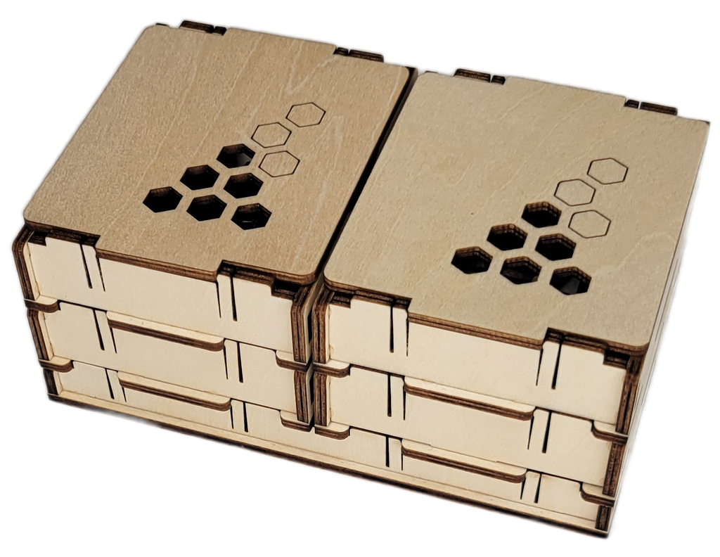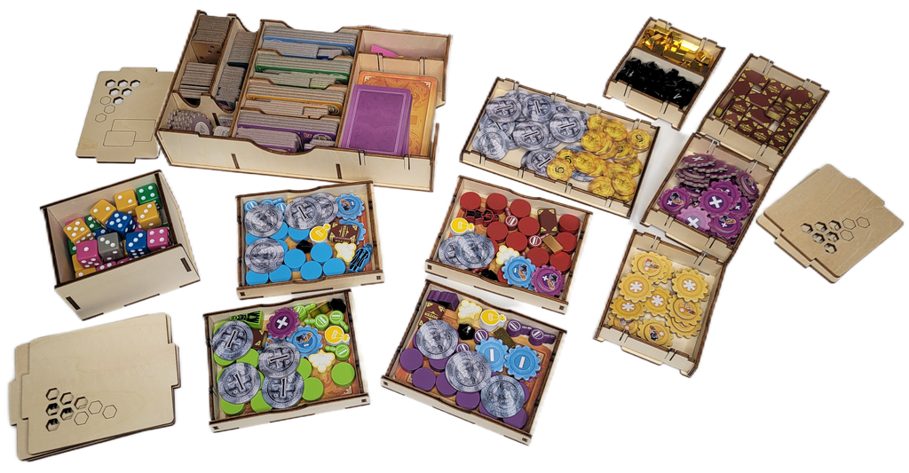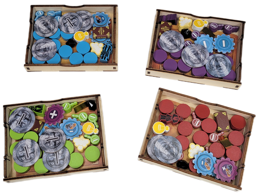 - 5 Boites empilables pour les Ressources (Charbon et Cuivre), les Pièces, les Engrenages violets, les Engrenages jaunes et les Livres