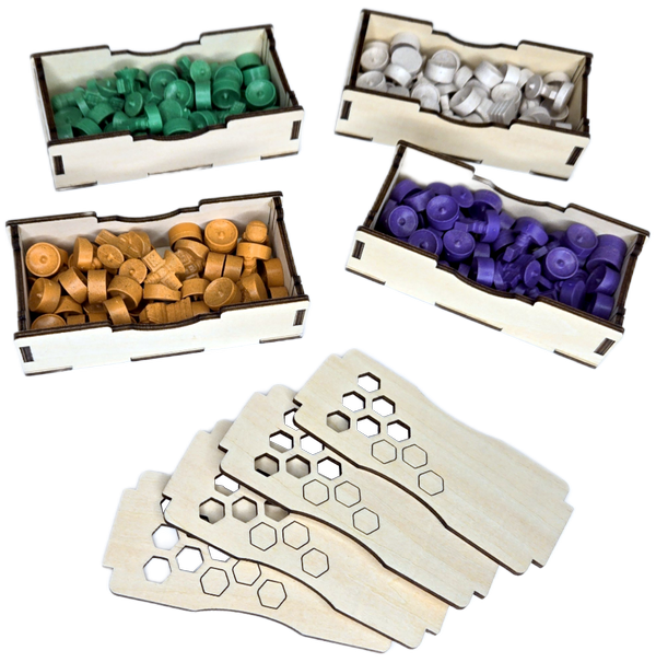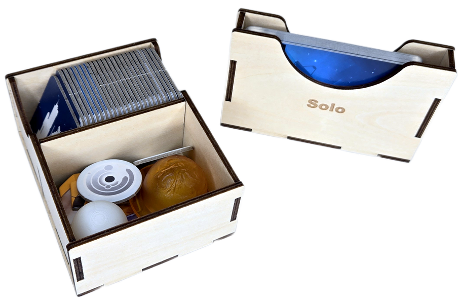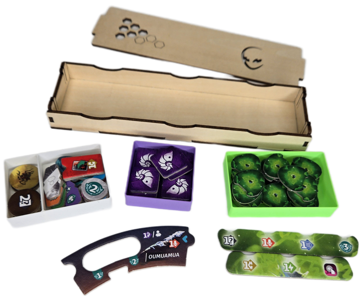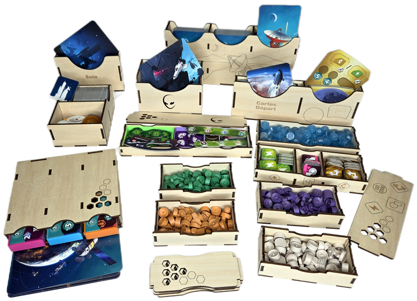 - 1 Rack à tiroir pour les 3 types de technologies et les cartes agences spatiales. Les tiroirs peuvent être placés directement sur le plateau de jeu.