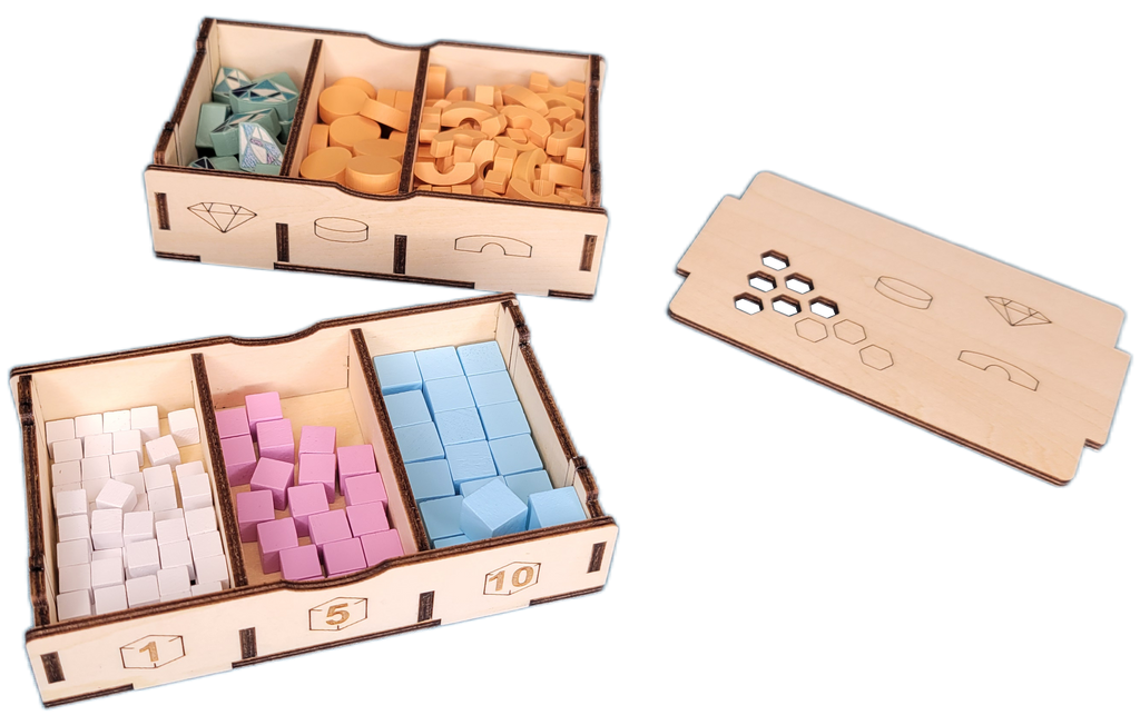 - 2 Boites empilables avec couvercle pour les Cubes Ressources, les Diamants, les Routes et les Disques Actions